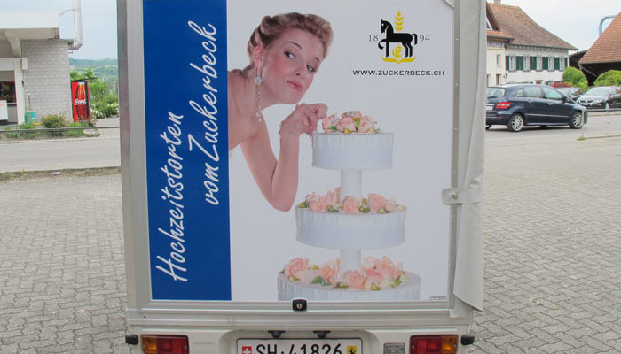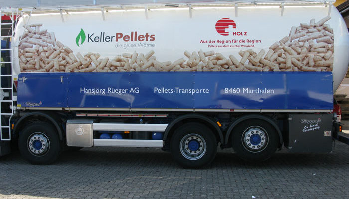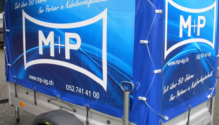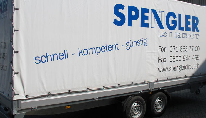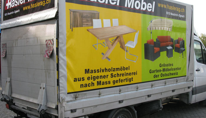 Zum Beispiel: Zugmaschinen, Auflieger, Transporter, auch ganzflächig mit Bild und Text.